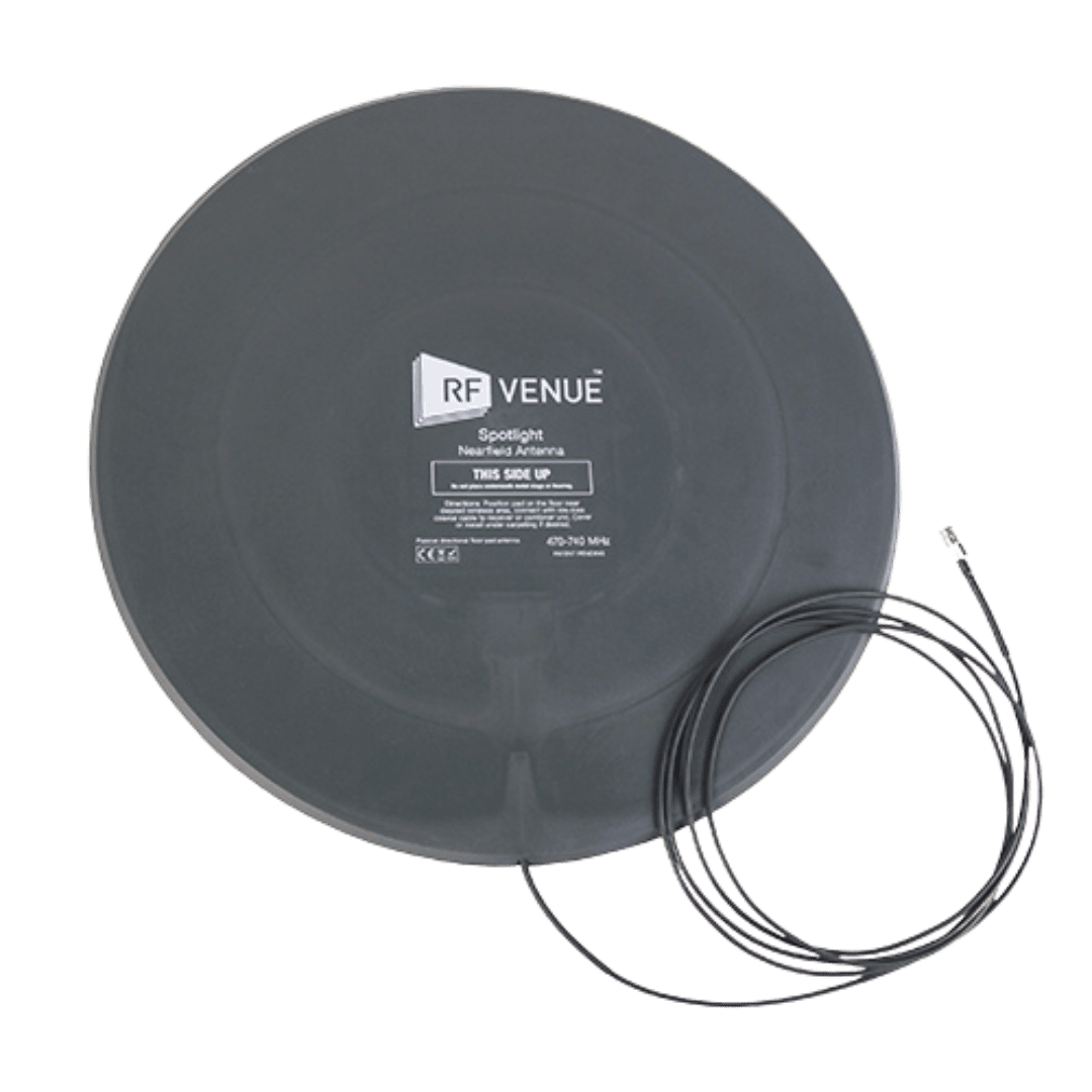 The RF Spotlight™ antenna is a low-profile floor pad antenna that enables wireless mics to function reliably in the most crowded RF environments. Perfect on stages, in hotel breakout rooms, at conventions or in churches, the RF Spotlight is effective where multiple wireless systems must inter-operate across facilities and open channels are limited.